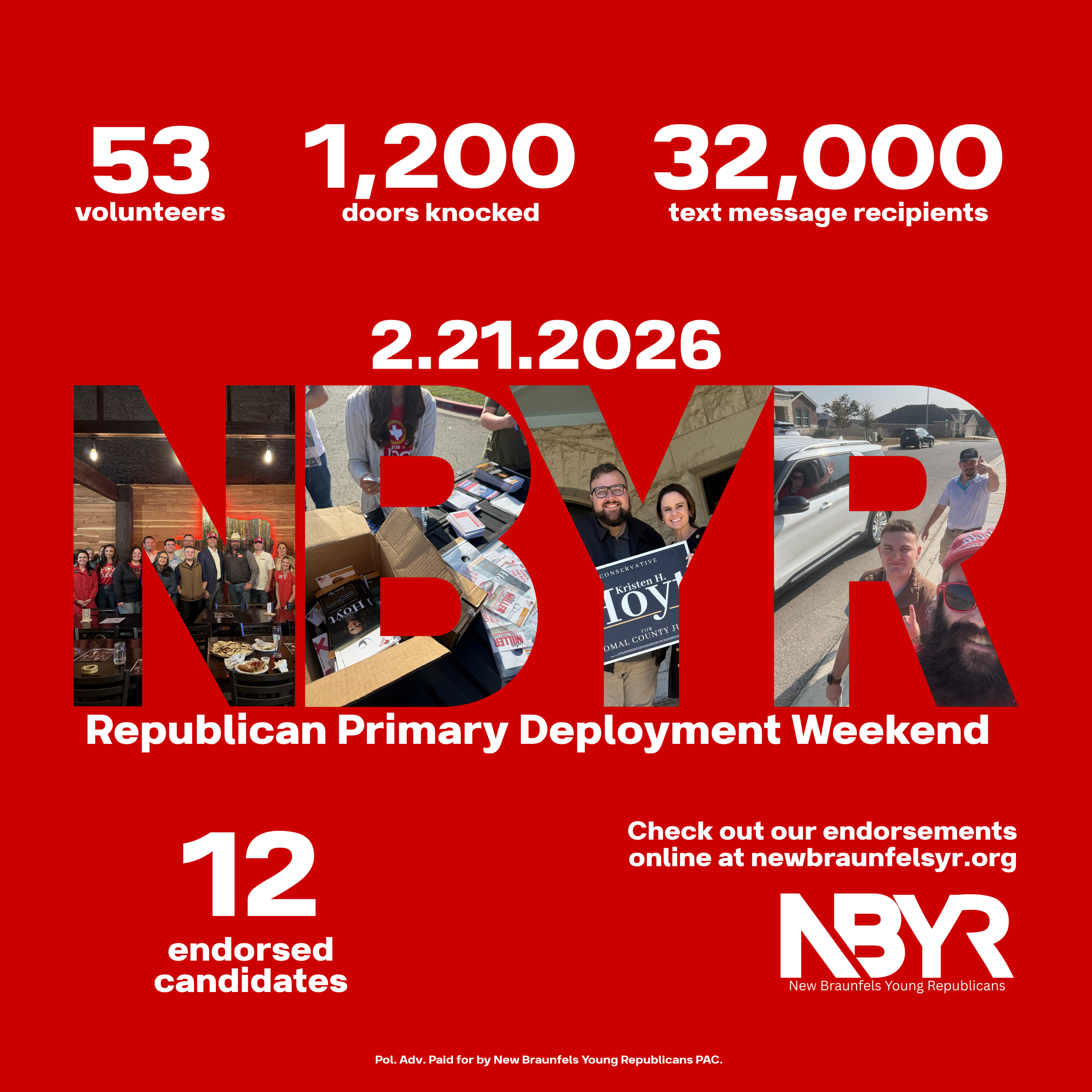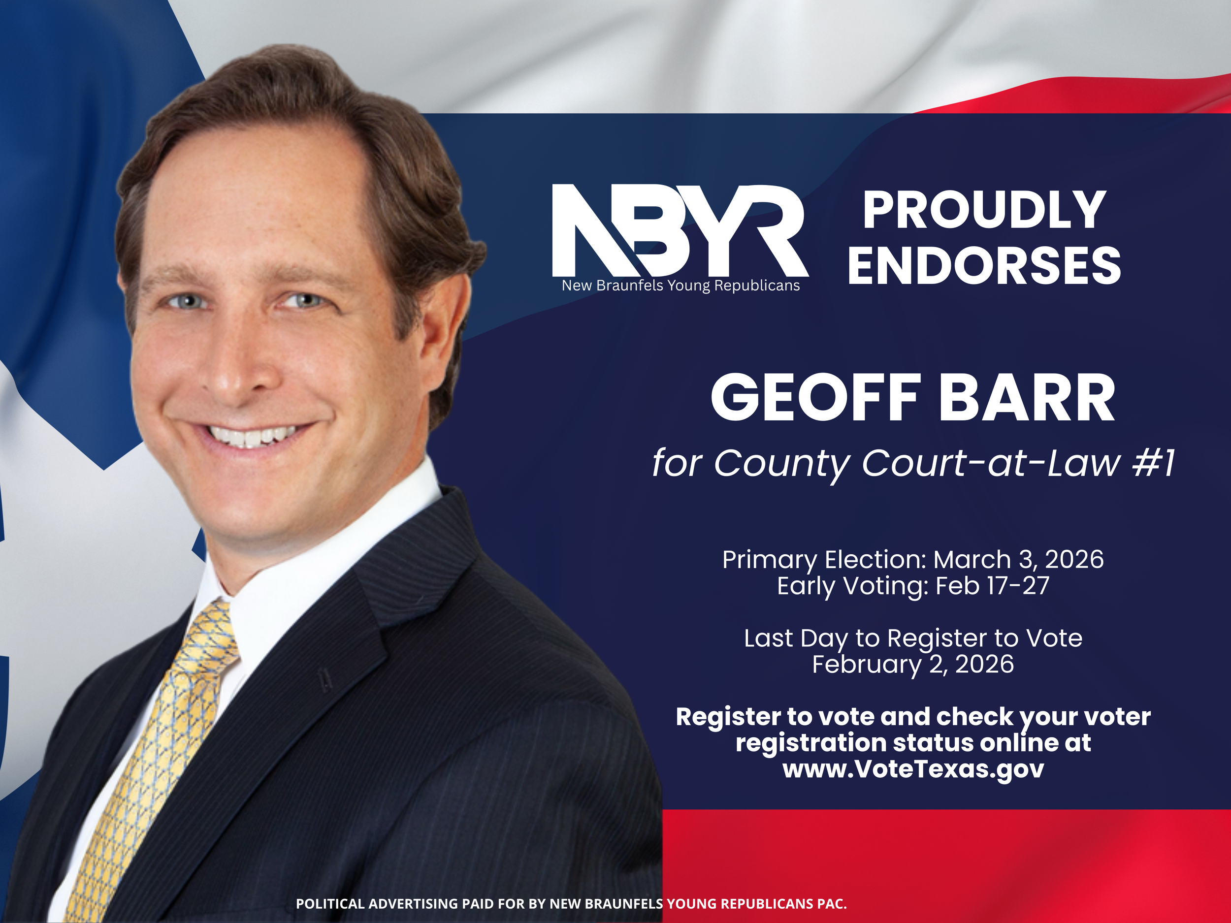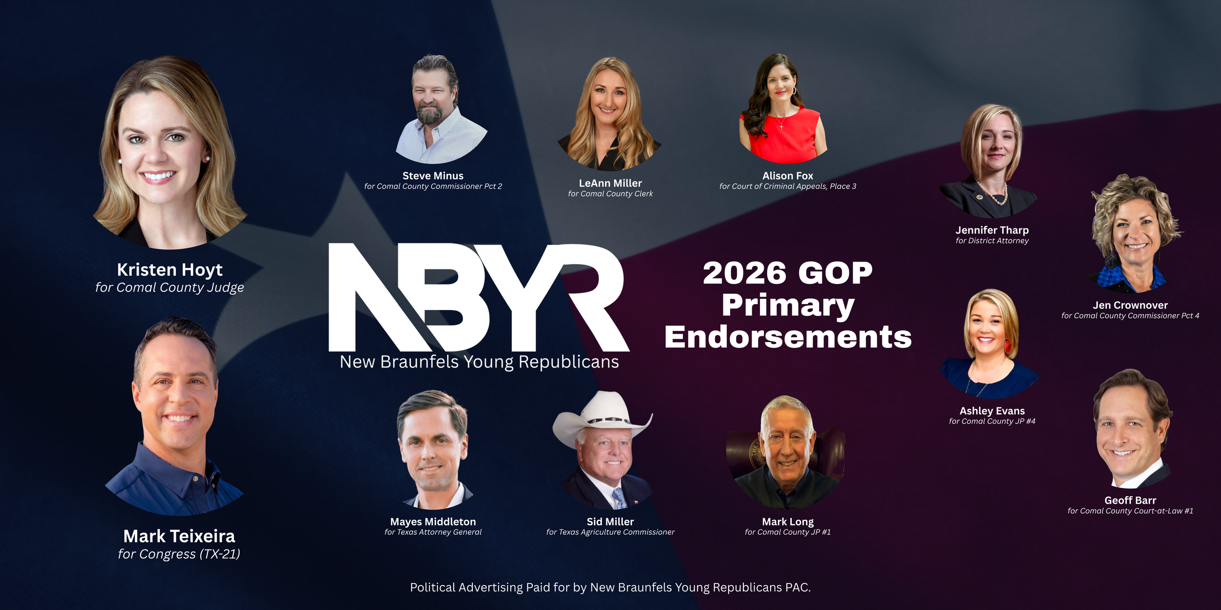 The New Braunfels Young Republicans are building the next generation of conservative leadership right here at home. We recruit, train, and equip young candidates to run for public office with conviction, integrity, and a heart for service. Our members don’t sit on the sidelines — we knock doors, make calls, endorse strong candidates, and help elect leaders who reflect the values of New Braunfels and Comal County.