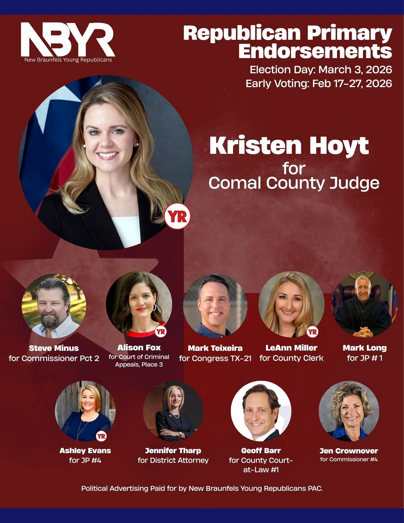 The New Braunfels Young Republicans are working today (2.21.2026) on the largest deployment of volunteers and block walkers in Comal County history. We are fighting for our endorsed candidates and they’re here with us today.